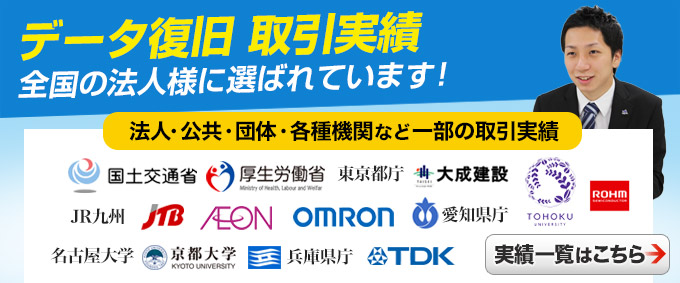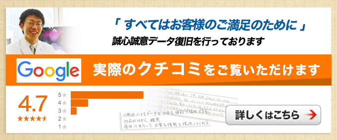 | お客様の声 | 数年にもわたって作ってきたデータだったので消したときは頭が真っ白になりましたが、 復元していただけて本当に助かりました。ありがとうございました。 |